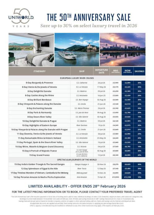 Be inspired on the river. See below a small selection of river cruises.... all offers are subject to availability and price may increase or decrease at any time...please call us for a quote on 01789 293737